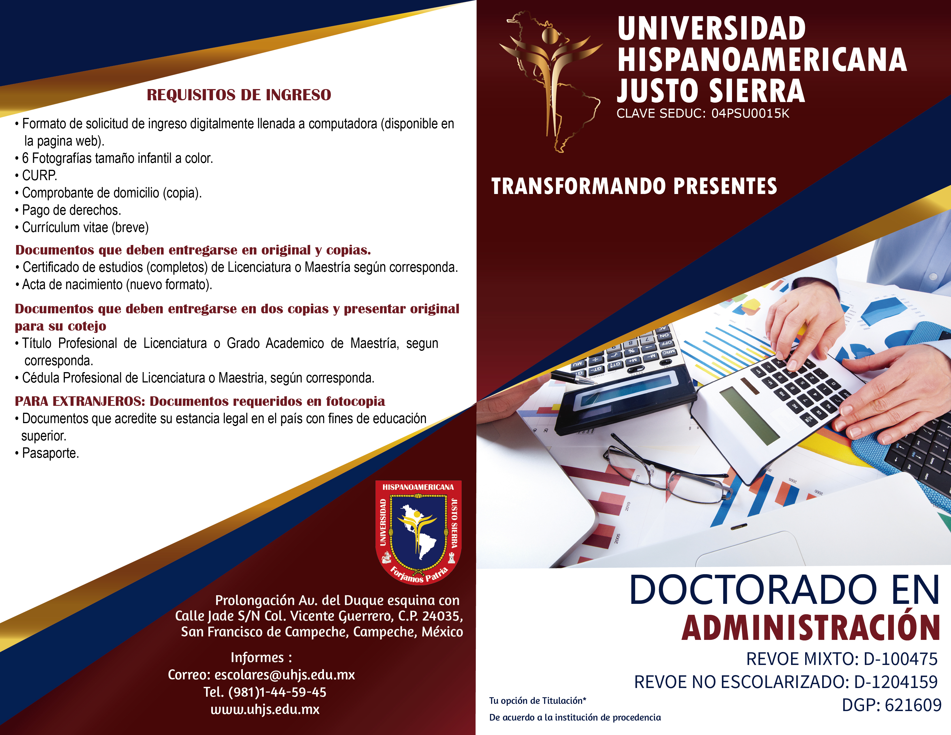 De Ingreso: Existen dos formas. En una, el estudiante se puede inscribir al Doctorado al concluir sus estudios de Licenciatura, y en la otra, la inscripción será después de la Maestría, lo que da origen a su versatilidad y flexibilidad en el ámbito del conocimiento y se integra en un diseño curricular con dos etapas diferenciadas e innovadoras. En ambas formas el egresado obtendrá el grado de Doctor en Ciencias de Administración..