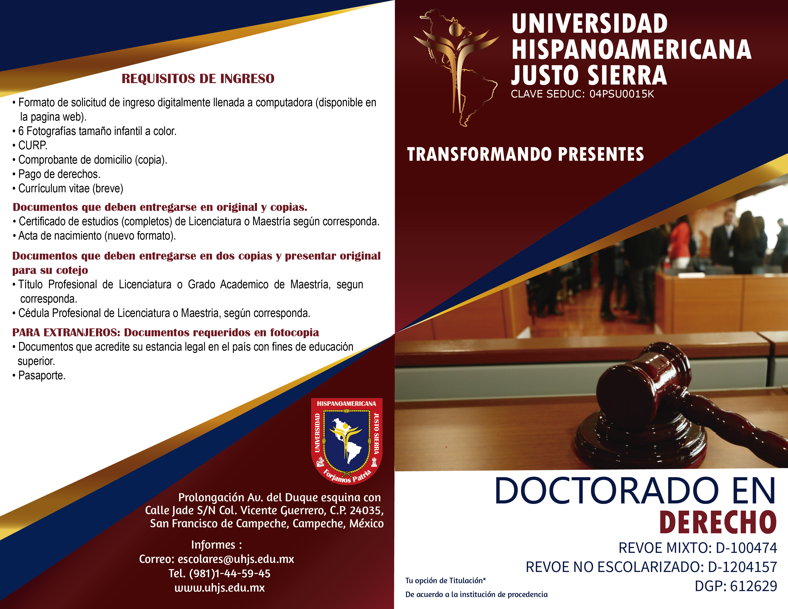 De Ingreso: Existen dos formas. En una, el estudiante se puede inscribir al Doctorado al concluir sus estudios de Licenciatura, y en la otra, la inscripción será después de la Maestría, lo que da origen a su versatilidad y flexibilidad en el ámbito del conocimiento y se integra en un diseño curricular con dos etapas diferenciadas e innovadoras. En ambas formas el egresado obtendrá el grado de Doctor en Ciencias Jurídicas.