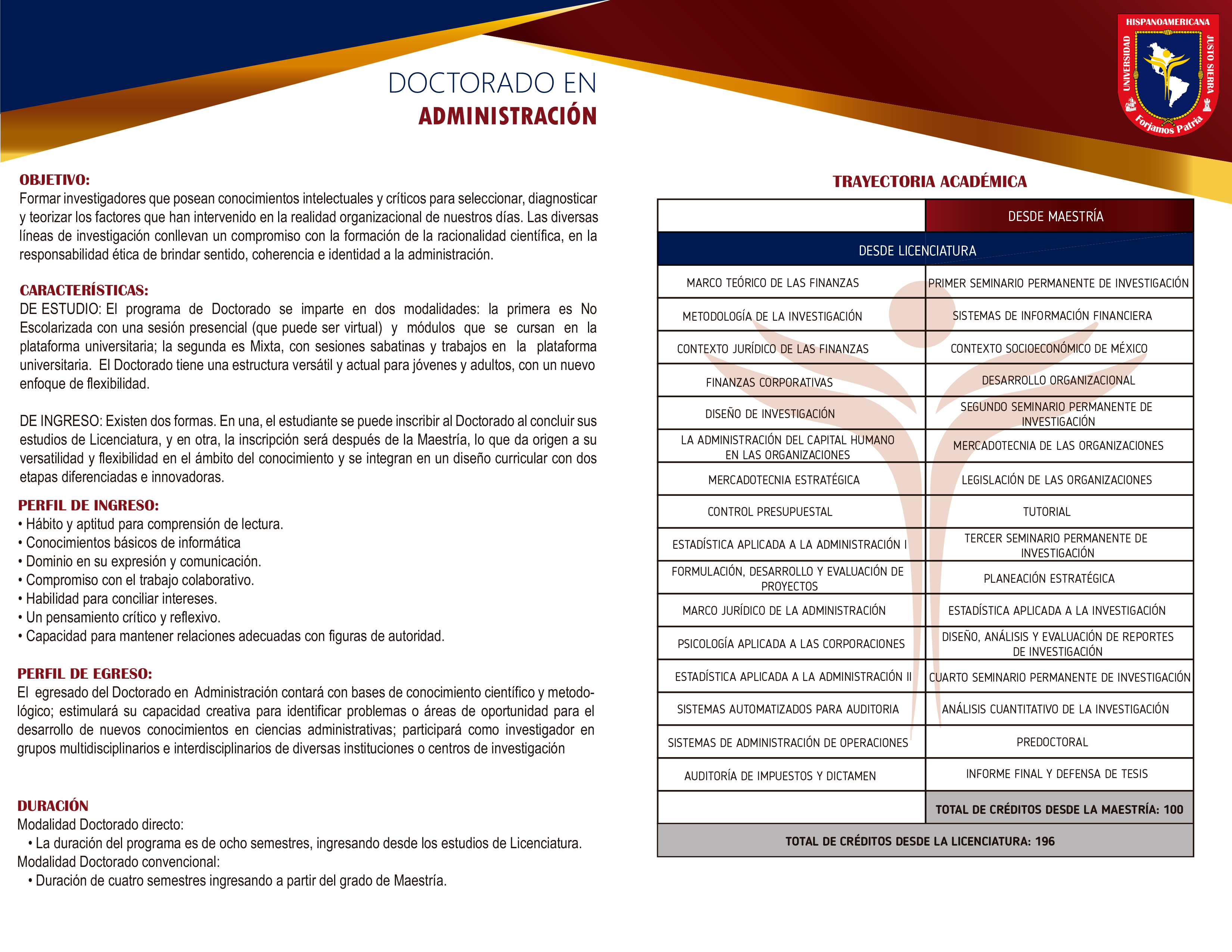 De Ingreso: Existen dos formas. En una, el estudiante se puede inscribir al Doctorado al concluir sus estudios de Licenciatura, y en la otra, la inscripción será después de la Maestría, lo que da origen a su versatilidad y flexibilidad en el ámbito del conocimiento y se integra en un diseño curricular con dos etapas diferenciadas e innovadoras. En ambas formas el egresado obtendrá el grado de Doctor en Ciencias de Administración..