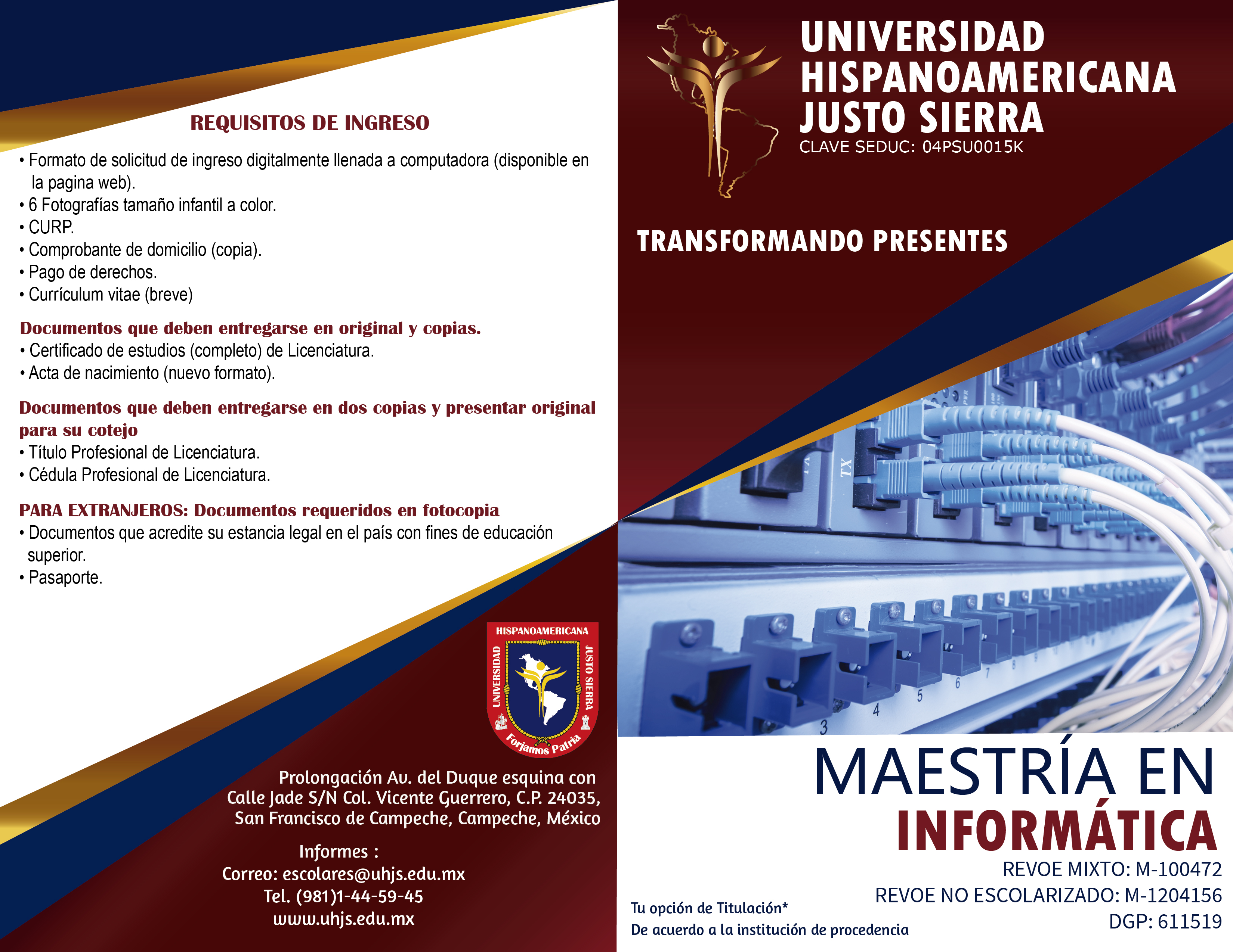 El programa de Maestría en Informática, se ofrece en dos modalidades: la primera en No Escolarizada (on-line) con una sesión presencial (que puede ser virtual) y módulos que se cursan en la plataforma de la Universidad; la segunda es la mixta con sesiones presenciales y trabajos en la plataforma Educativa Institucional; ambas promueven la participación activa del alumno en su formación profesional y personal, mediante el aprendizaje individual, grupal y colaborativo.