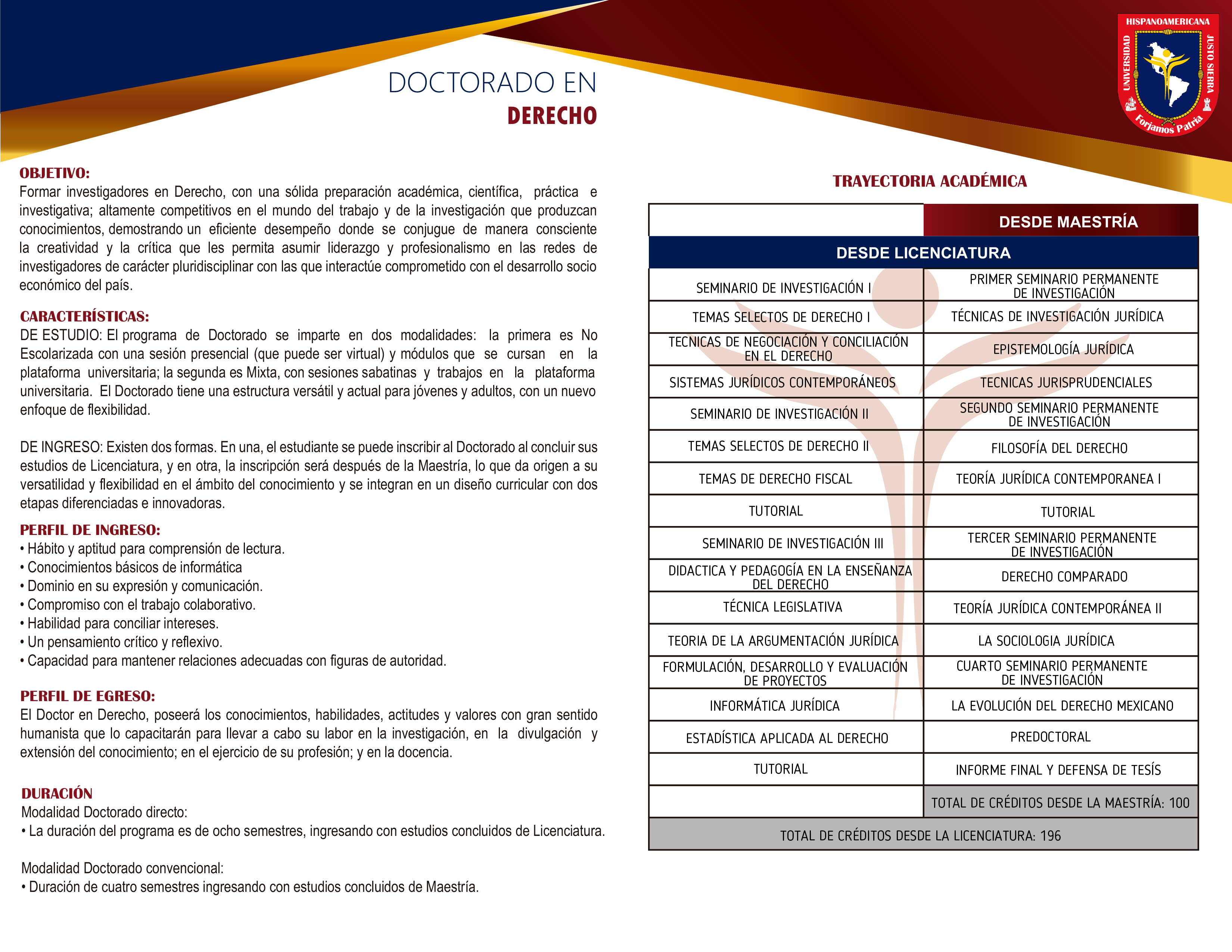 De Ingreso: Existen dos formas. En una, el estudiante se puede inscribir al Doctorado al concluir sus estudios de Licenciatura, y en la otra, la inscripción será después de la Maestría, lo que da origen a su versatilidad y flexibilidad en el ámbito del conocimiento y se integra en un diseño curricular con dos etapas diferenciadas e innovadoras. En ambas formas el egresado obtendrá el grado de Doctor en Ciencias Jurídicas.