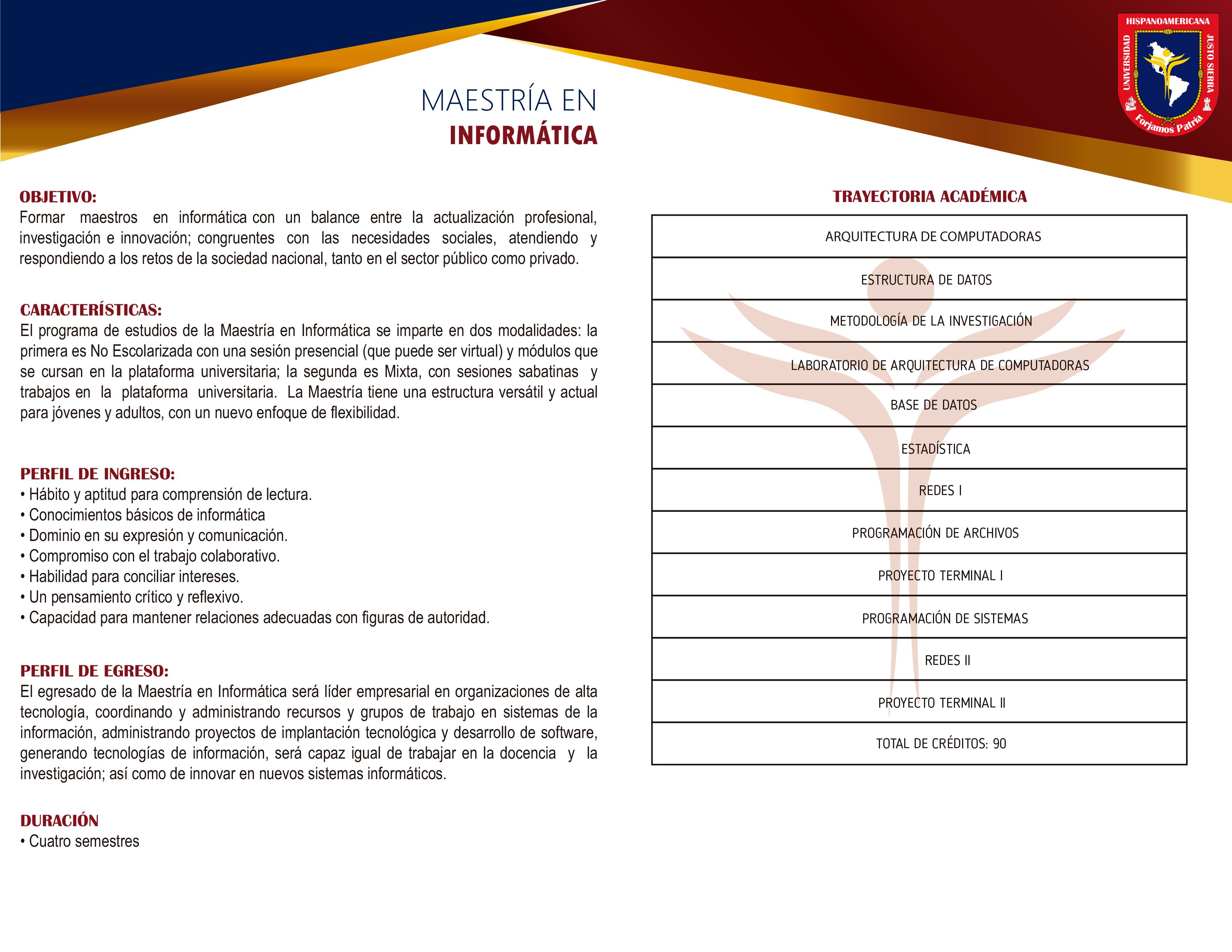 El programa de Maestría en Informática, se ofrece en dos modalidades: la primera en No Escolarizada (on-line) con una sesión presencial (que puede ser virtual) y módulos que se cursan en la plataforma de la Universidad; la segunda es la mixta con sesiones presenciales y trabajos en la plataforma Educativa Institucional; ambas promueven la participación activa del alumno en su formación profesional y personal, mediante el aprendizaje individual, grupal y colaborativo.
